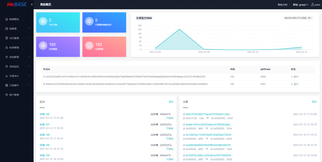 WeBASE支持将链上数据导出到传统存储设备中,让常规数据分析成为可能。为支持更丰富的监管功能,我们后续也会推出功能更全数据监管平台,不但可实现链上数据的展示、搜索、审计,还可对违规数据进行干预。