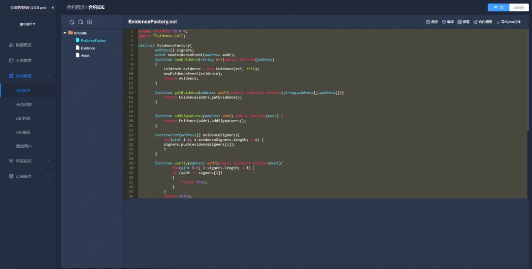 WeBASE-Front集成了智能合约IDE,支持Solidity语言,支持使用JS本地编译,在线部署,多文件管理,自动生成Java类,交易测试等非常实用的功能。