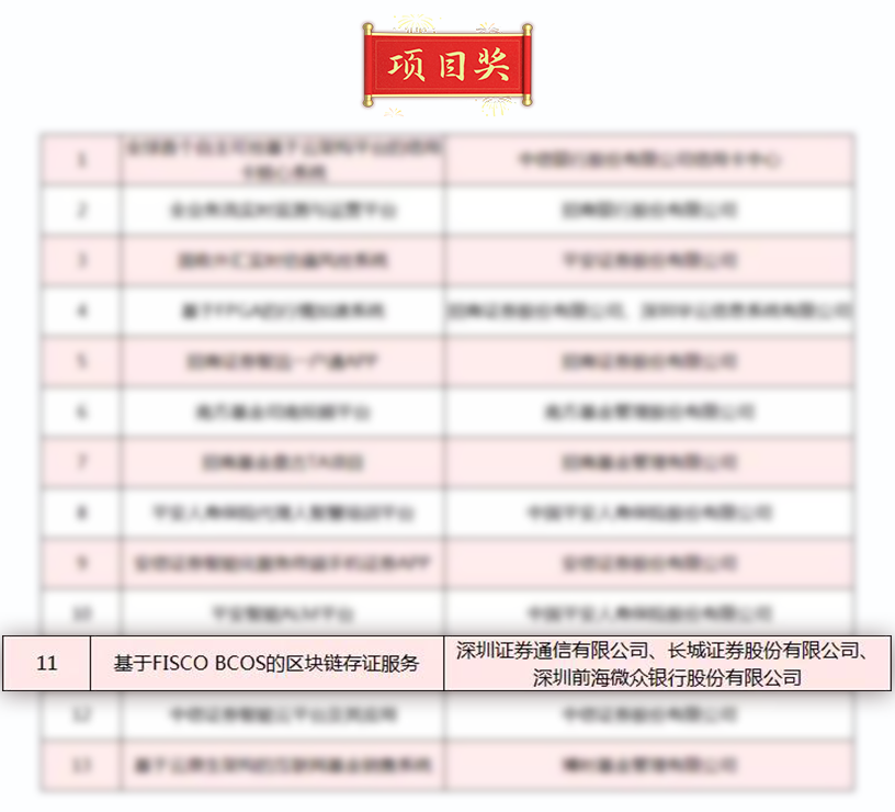 近日,深圳证券通信有限公司、长城证券股份有限公司与深圳前海微众银行股份有限公司联合申报的“基于FISCO BCOS的区块链存证服务”项目荣获第二届香蜜湖金融科技创新奖优秀项目奖,成为22个获奖项目/单位中唯一基于区块链技术的获奖项目。