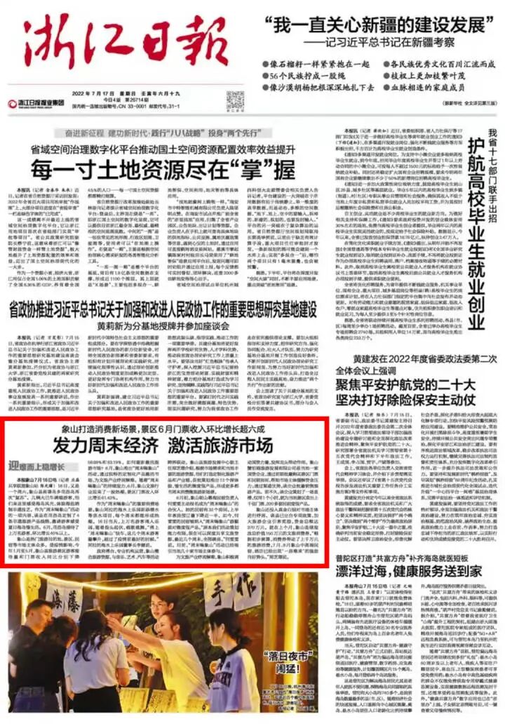7月17日,《浙江日报》头版刊登《象山打造消费新场景:发力周末经济 激活旅游市场》。一起来阅读全文↓