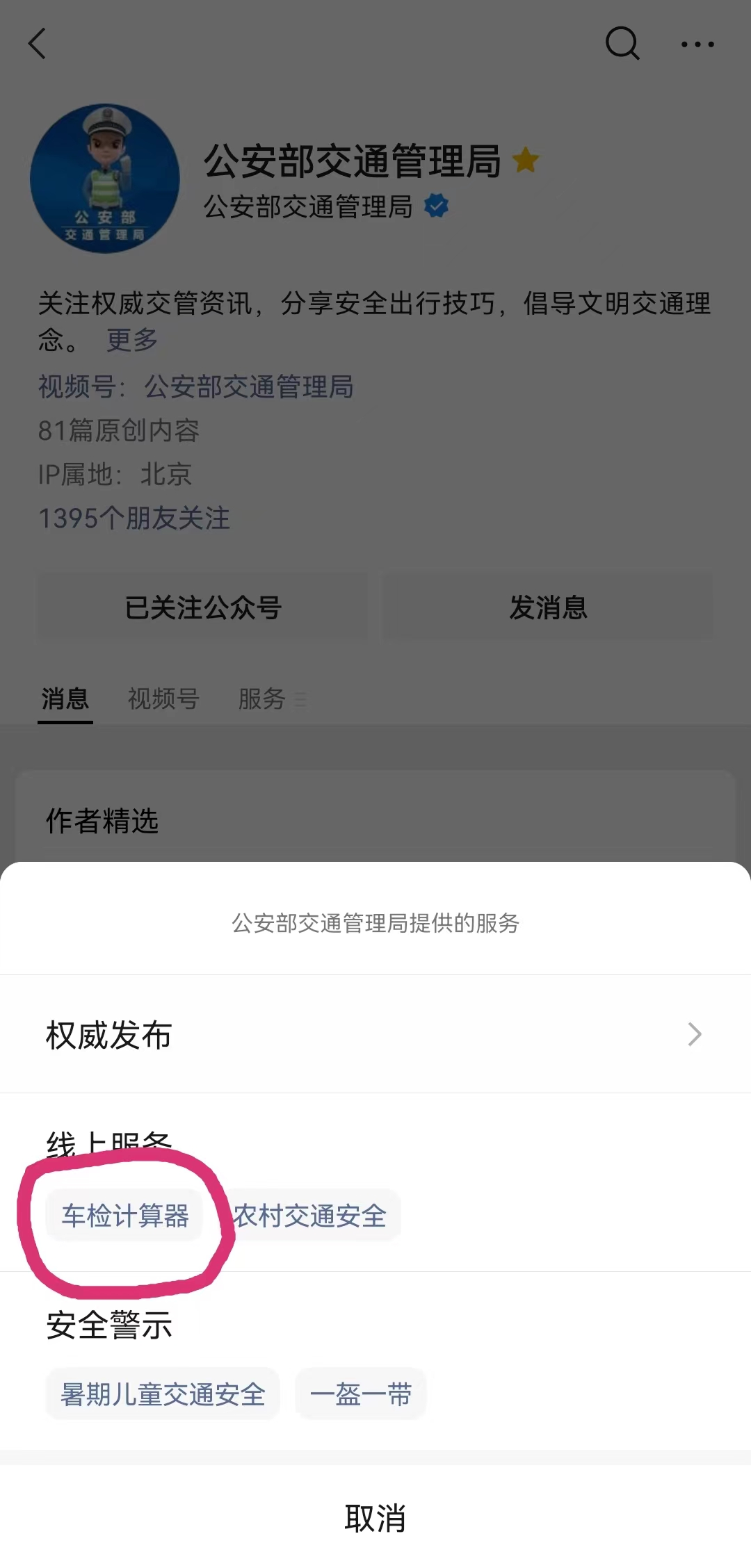 近日,公安部、市场监管总局、生态环境部、交通运输部联合印发《关于深化机动车检验制度改革优化车检服务工作的意见》,其中提出一项备受群众期待的措施,即:优化调整非营运小微型载客汽车(9座含9座以下,面包车除外)、摩托车检验周期。此次优化调整后,广大车主名下注册登记的私家车、摩托车,10年内(含10年)只需要上线检验2次,10年后统一为每年上线检验1次。为了方便广大车主查询自己名下车辆的下次上线检验时间,公安部交通管理局开发了“车检计算器”小程序,只需选择注册登记时间,即刻就能知道结果!第一步,打开公安部交通管理局微信公众号主页,点击“服务”标签。▼