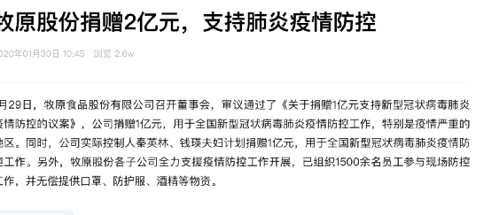 2020年,牧原股份为支援抗疫,一下子捐了两个亿。