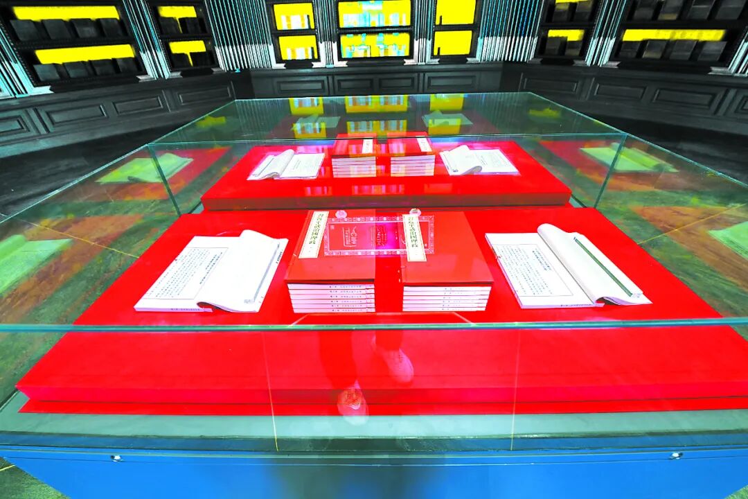 图为在中国国家版本馆中央总馆“真理之光——马克思主义中国化时代化经典版本展”中,展出的《习近平谈治国理政》第一卷至第四卷。(图片来源:人民视觉)