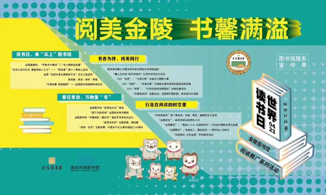 “世界读书日”期间,金图以“阅美金陵 书馨满溢”为主题,开展了以“科学的南京”第二季、“阅美”系列活动之“文都文影”读者征文摄影大赛、“书海好景”文旅融合图书推荐创意短视频和“中华经典诗词诵唱绘”少儿作品征集活动为主体的近百场阅读推广系列活动。