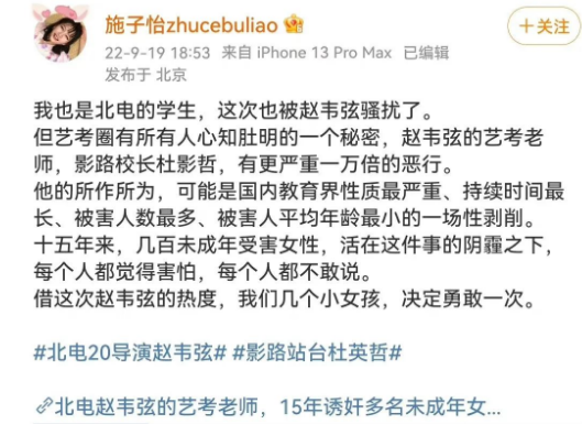 我也是北电的学生,也被20导演赵韦弦骚扰了。