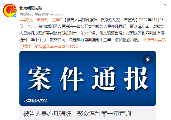 可能他不知道有个成语叫“一语成谶”,有些的预言,是会应验的。就在2022年11月25日,北京朝阳法院一审公开宣判了结果:“对被告人吴亦凡以强奸罪判处有期徒刑十一年六个月,附加驱逐出境;数罪并罚,决定执行有期徒刑十三年,附加驱逐出境。”