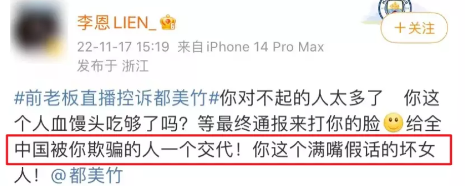 这段时间虽然还没最终定罪,但舆论风向一直更偏向都美竹。直到前几天,都美竹前老板在直播中控诉都美竹立人设,撒谎成性。原本在网上大骂吴亦凡的都美竹闺蜜也爆料她满嘴谎话,根本没有强奸、没有受害者、没有未成年,谎称抑郁症,其实是在整容。