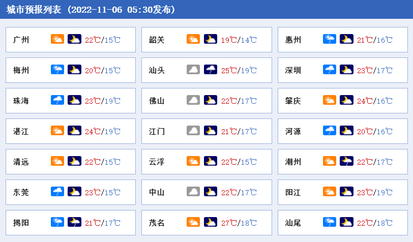 6日,广东省大部市县阴天间多云,有小雨局部中雨。最低气温:粤北市县13~16℃,其余大部市县16~19℃。