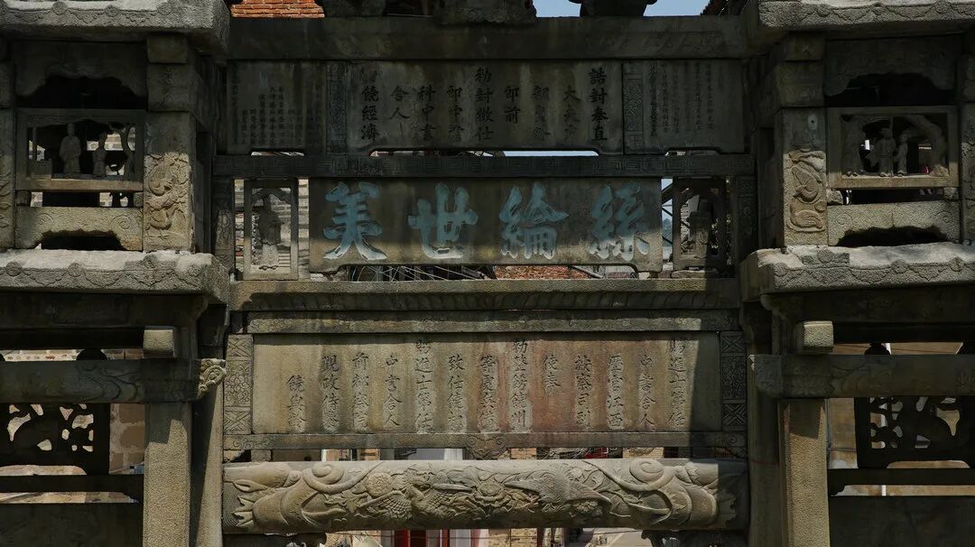 父子进士牌坊,修建于明万历三十八年(1610年),是一座三间五楼花岗岩石牌坊,结构严谨精致、造型美观大方。