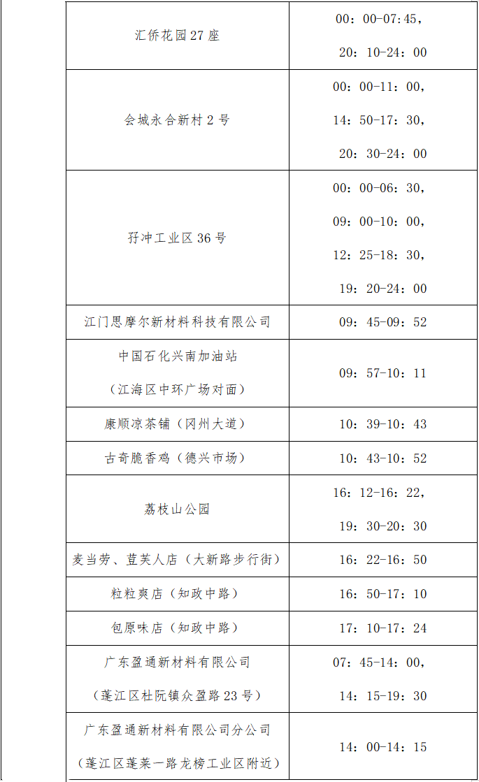 8月29日活动轨迹涉及古记肠粉店、三津汤包(凯旋城北区)、肖大妈凉皮(中兴三路)、金沙世纪城南面的文化广场、凯旋城千家汇生活超市。8月30日活动轨迹涉及小湘厨餐饮店(凯旋城北区)、果源鲜水果店(中兴北路)。8月31日活动轨迹涉及中大惠亚医院、神掌现捞(天悦龙庭店)、梦之恋理发店、凯旋城千家汇生活超市。9月5日因发现健康码“黄码”,于当天上午步行前往中大惠亚医院黄码区开展核酸采样后返回住所,当晚20:00时到小区保安亭附近水果店买水果。9月6日凌晨核酸检测阳性后被纳入管控,经专家组会诊,诊断为新冠病毒无症状感染者,目前已被送至定点医院隔离治疗。江门新会新增6例新冠肺炎阳性个案