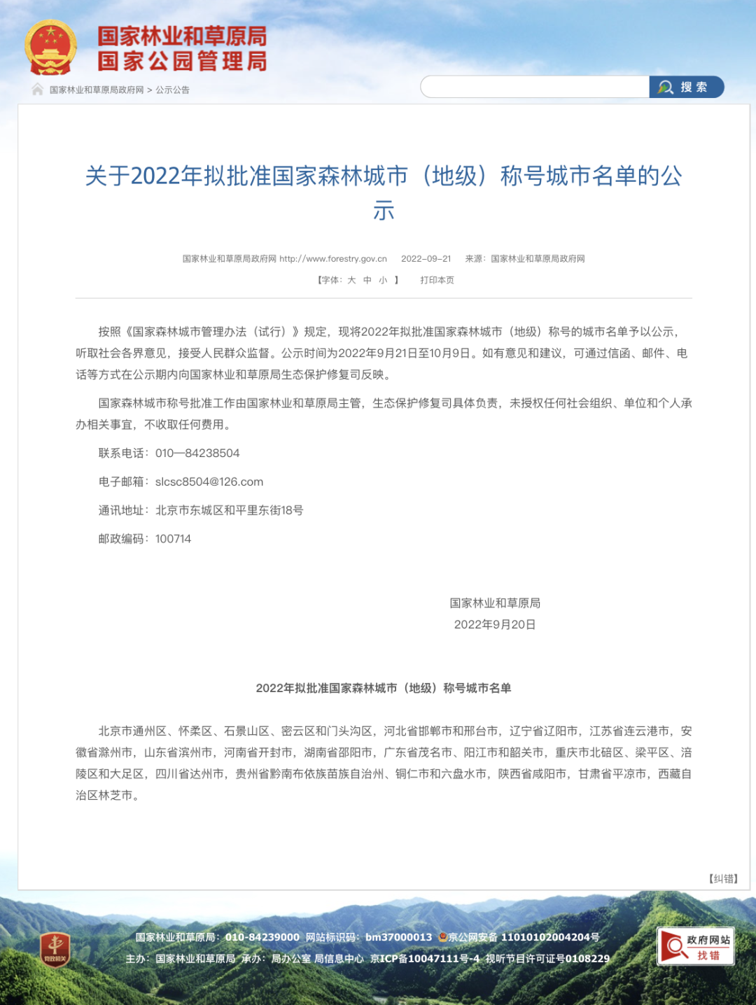 21日,国家林业和草原局官方网站发布了《关于2022年拟批准国家森林城市(地级)称号城市名单的公示》,广东茂名、阳江和韶关入选。根据该公示,2022年拟授予国家森林城市称号的地级市共有27个,广东是入选城市数量最多的省。