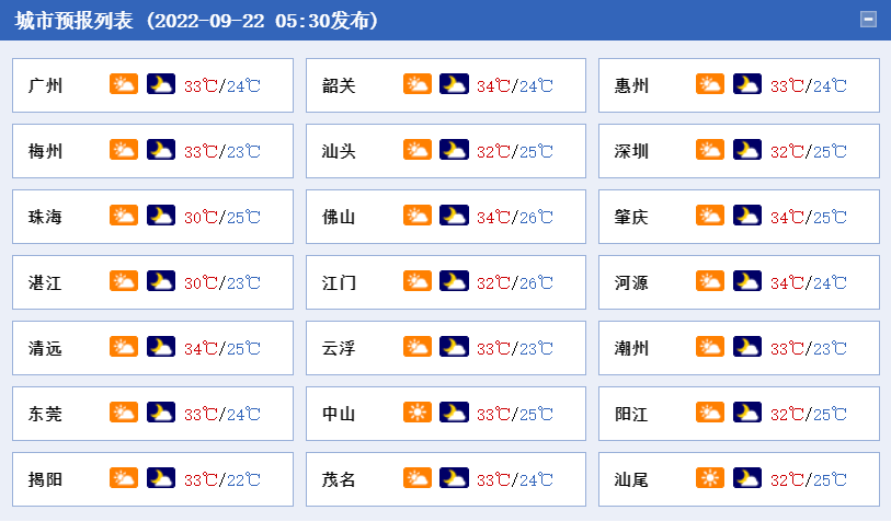 22日,粤北市县晴到多云,雷州半岛多云有(雷)阵雨,局部大雨,其余市县多云到晴为主,有分散阵雨。最高气温:南部沿海市县29~31℃,其余大部分市县31~34℃,个别市县35℃。