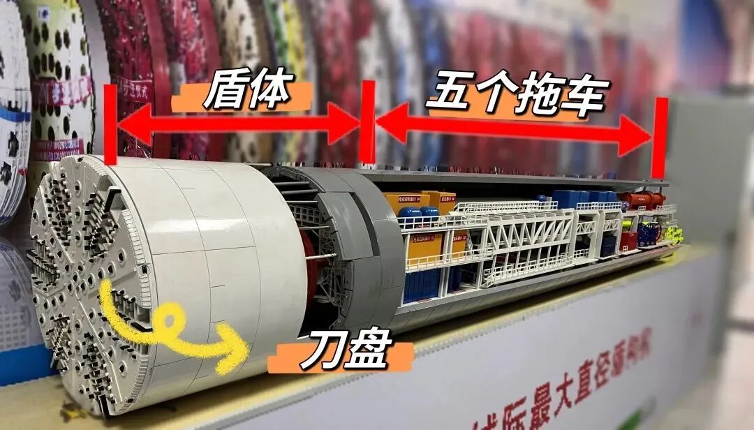 盾构机的结构有点像火车,由刀盘、盾体、配套拖车组成。“深江2号”共有5节,行走机构在最前面,后面一节节加挂。