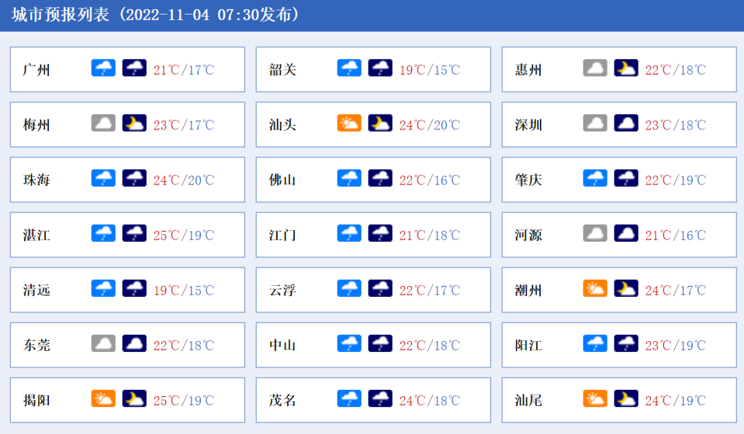 4日,广东中西部市县阴天间多云,有小雨,局部中雨,其余市县多云到阴天,有分散小雨。最低气温:粤北市县16~18℃,其余大部分市县18~21℃。