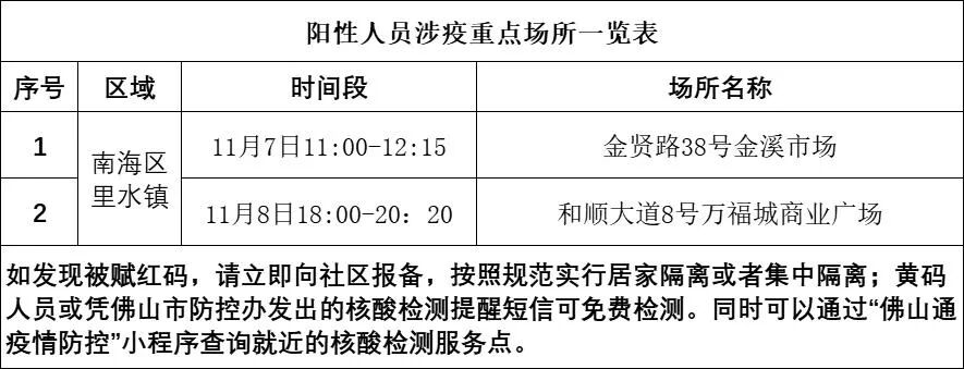 个案1居住在南海区里水镇,自行到便民核酸采样点进行核酸采样,11月9日核酸检测阳性。个案2作为个案1的密接(同住人员)纳入隔离管控,隔离管控期间核酸检测阳性。