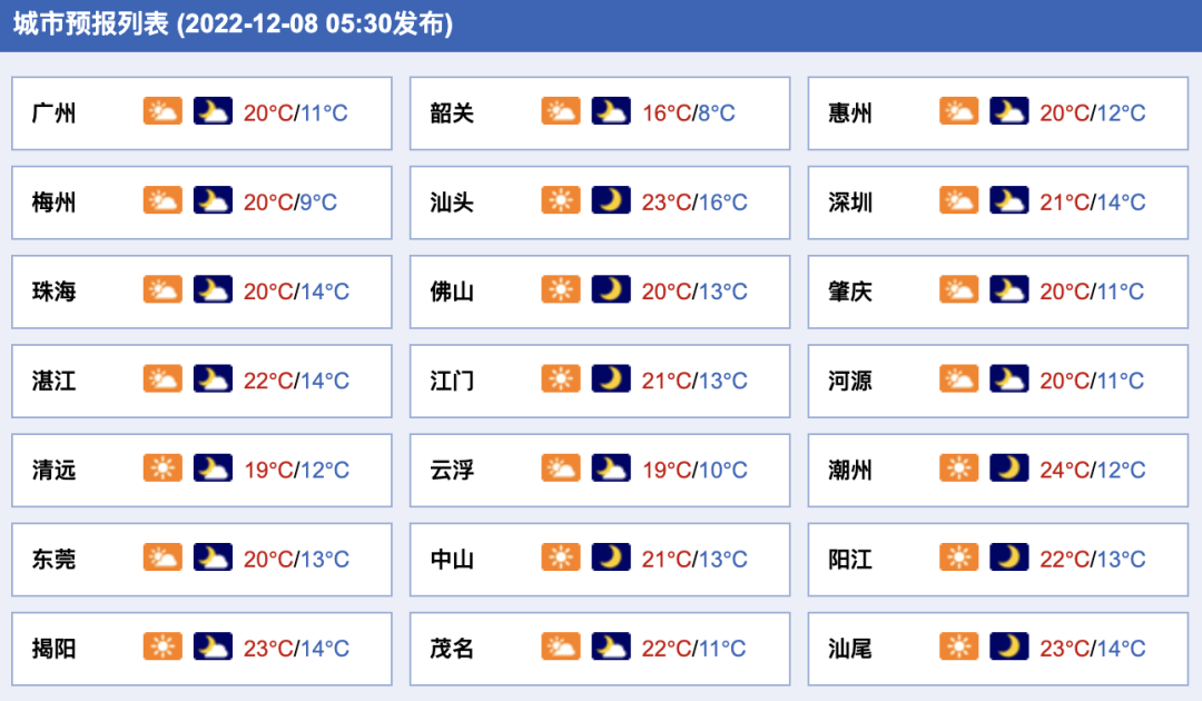 8日—9日,大部分市县多云到晴。最低气温:粤北部市县8~11℃,沿海市县14~17℃,其余市县12~14℃。