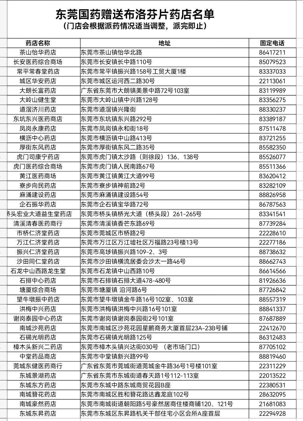 12月22日和23日,每天16:00,大参林将向有需要的东莞市民免费发放布洛芬。有需要的东莞市民可前往大参林指定的10家门店领取,门店覆盖东莞市10个镇区。