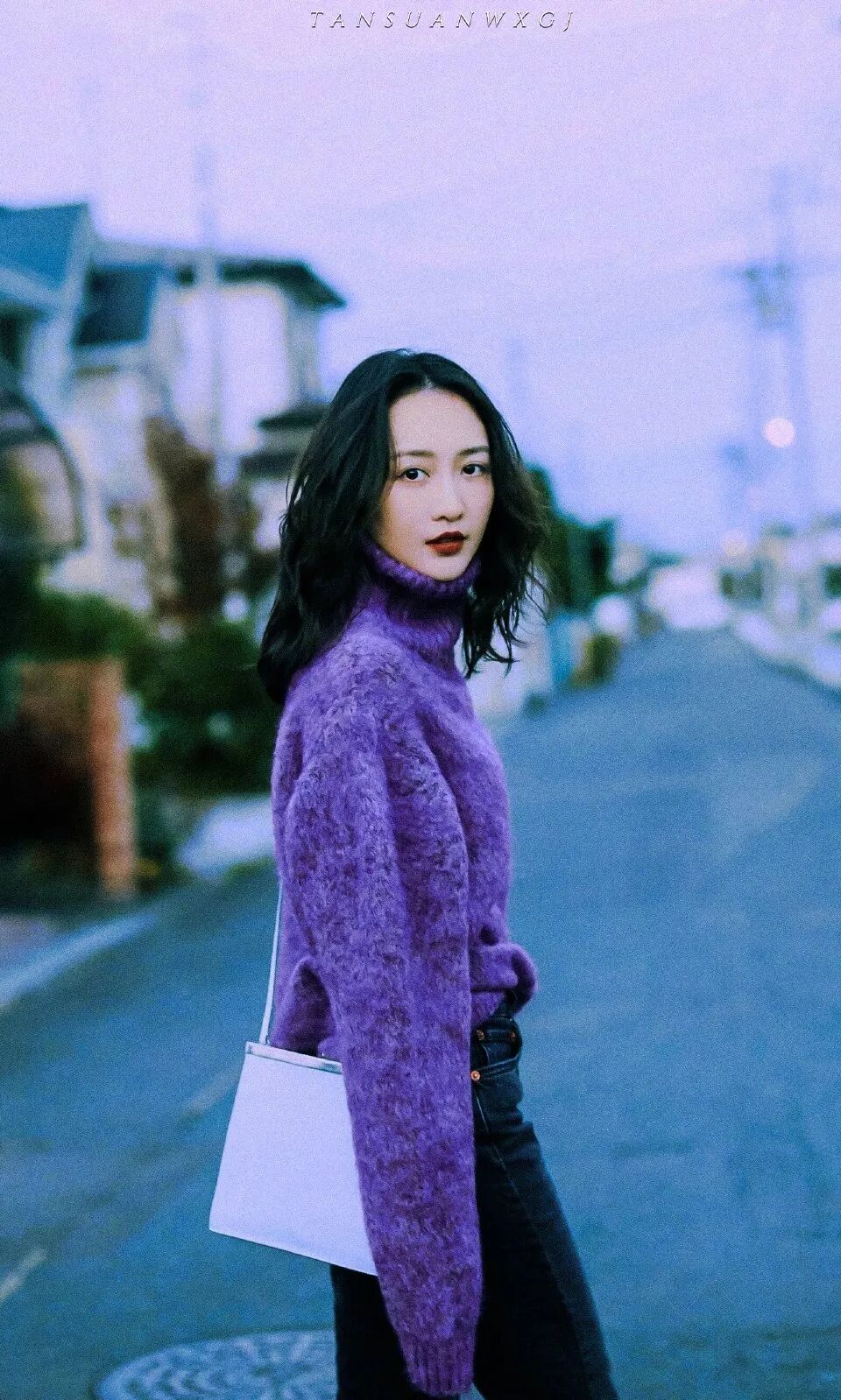 紫色高领毛衣搭深色牛仔裤,斜挎小方包简约优雅,将简简单单的出街三件套穿出了无与伦比的美丽。