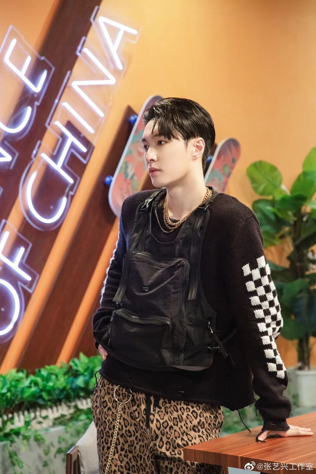就像张艺兴这样,以黄金项链+机能风马甲,搭配豹纹长裤,再加上与豹纹同色系的低帮帆布鞋,简单又舒适。