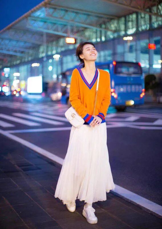 马思纯十分会利用简约的单品修饰自己的缺陷,V领领口不仅能拉长脸型,还有显高的作用。比如用V领上衣打底搭配高腰半裙,整体造型轻盈又舒适。