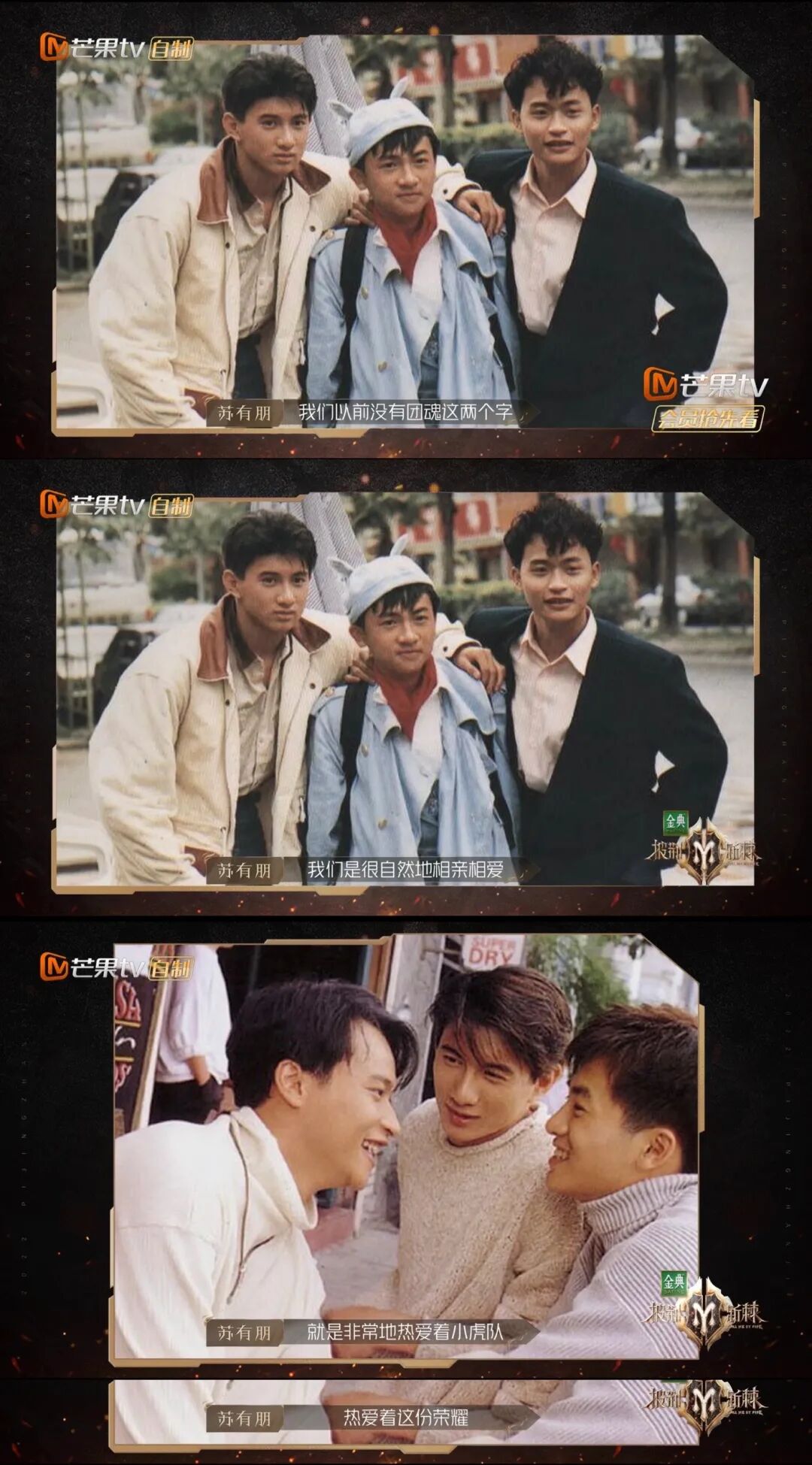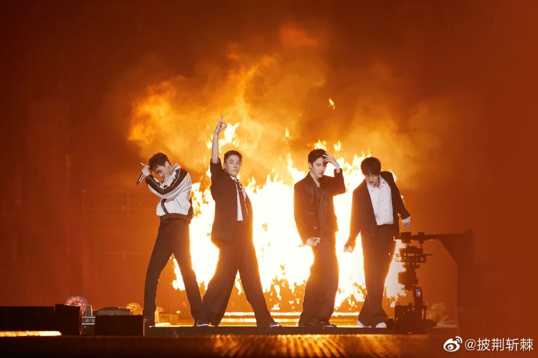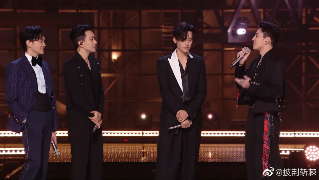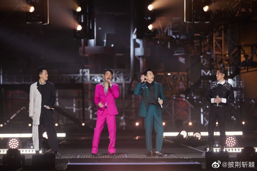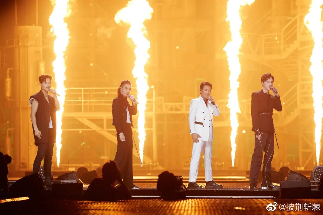 吴建豪、Mike、朱嘉琦、范世琦共同带来火热的《爱的主打歌》。吴建豪手抓弯钩“空降”舞台,臂力惊人,氛围感拉满。演唱了盆栽哥的英文歌《Save Your Tears》,炫酷发型配西装,舞台魅力太强了!头发一如既往的柔顺,哥哥的状态完全不输给当年的《流星花园》!手握立麦献唱,气氛迷幻撩人。黑白夹克内搭花衬衫复古感拉满,配上甜蜜笑容,戳中谁的心巴了?信、马頔、郝云、郑钧四个诗意吉他少年合作《私奔》。信一张口,易姐的DNA就动了!没有一个人的KTV没有这首《死了都要爱》!一身纯白套装,文艺清新风穿搭也能靠音乐high翻全场!一身红黑水墨撞色衬衫搭配灰色紧身牛仔裤,经典旋律配上熟悉的立麦、墨镜,燃动全场,易姐的摇滚魂瞬间被唤醒!任贤齐、黄义达、周柏豪、仁科合作带来《伤心太平洋》。任贤齐再唱“深深太平洋底,深深伤心”,果然经典能在任何时代引发共鸣!还记得创造了无数经典的任贤齐曾经人气直逼“四大天王”,是新世纪初周杰伦之前的“顶流”,他的唱片销量记录至今无人能破。再看哥哥对舞台的珍惜和用心的态度!小齐哥当之无愧是本场个人喜爱度第一的King!张震岳、潘玮柏、吴克群、杨长青合作舞台《思念是一种病》,这群火热的男孩们又酷又可爱。潘玮柏的《逃离地球》,一身黑色内搭配红色廓形大衣,rapper的魅力尽显,张力十足。张智霖、刘恺威、蔡珩、王大陆合唱《我还年轻我还年轻》 蔡珩初舞台《我还年轻我还年轻》唱跳技能双双在线,激情澎湃的唱功加上舞蹈直接点燃全场!扫腿完全是初舞台的高光killing part,不愧是我们的“芭蕾王子”!杜德伟、李承铉、张峻宁、方逸伦一起合作《拯救地球》。他们可是真正的初代顶流偶像团体,看乖乖虎苏有朋唱《爱》和《红蜻蜓》是真的“爷青回”!苏有朋后台采访让人泪目,温柔真挚的情感真的好戳人:可能就因为,它永远是我们心底那最美好又回不去的青春吧。