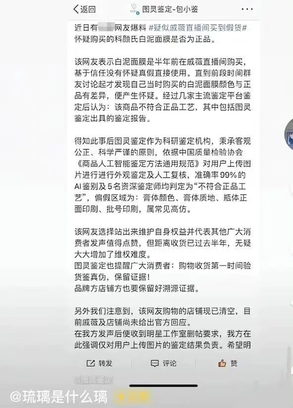 因发现产品颜色不对,便发文质疑戚薇卖假货。