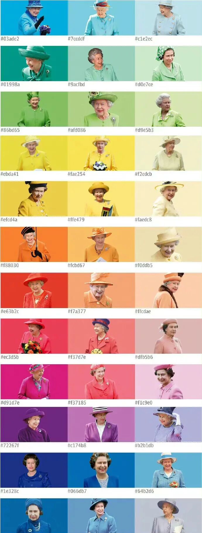 回看她在位的近70年,每次公开亮相都一丝不苟,从早年的宫廷华服,到近年的彩虹色系套装。