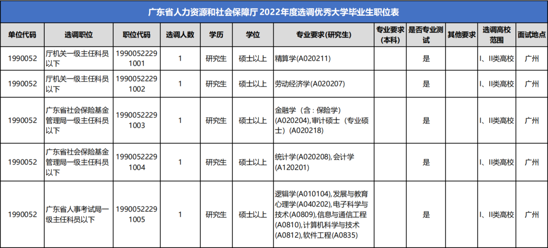 全省共计划选调应届优秀大学毕业生1993名,报考者可通过广东组织工作网(https://www.gdzz.gov.cn)、广东省人力资源和社会保障厅网(http://hrss.gd.gov.cn)、广东人事考试网(http://rsks.gd.gov.cn)或“粤省事”“广东选调生招录”微信公众号查阅具体的选调机关、职位、人数和报考资格条件。具体职位信息见《广东省2022年度选调优秀大学毕业生职位表》(附件1)。