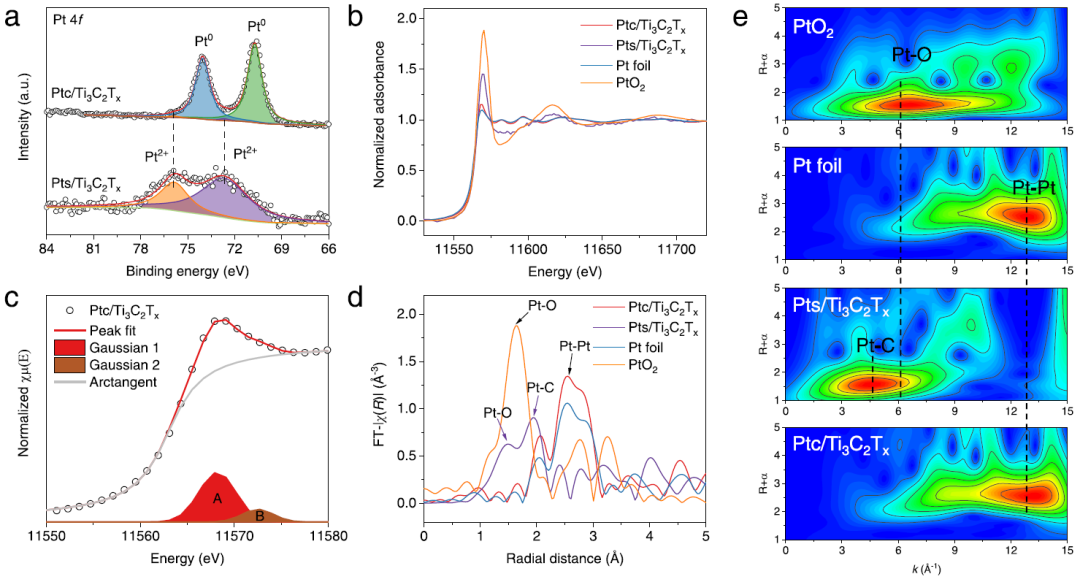 图 2. (a) Ptc/Ti3C2Tx 和 Pts/Ti3C2Tx的高分辨率 Pt 4f XPS 光谱。(b) Ptc/Ti3C2Tx, Pts/Ti3C2Tx, Pt foil, 和 PtO2 的归一化 Pt L3-edge XANES。(c) Ptc/Ti3C2Tx的 Pt L3-edge XANES 光谱的白线峰拟合分析。(d) Ptc/Ti3C2Tx, Pts/Ti3C2Tx, Pt foil, 和 PtO2 的 FT k3χ(R) Pt L3-edge EXAFS 光谱。(e) Ptc/Ti3C2Tx, Pts/Ti3C2Tx, Pt foil, 和 PtO2 的 Pt L3-edge EXAFS 信号的WT图。