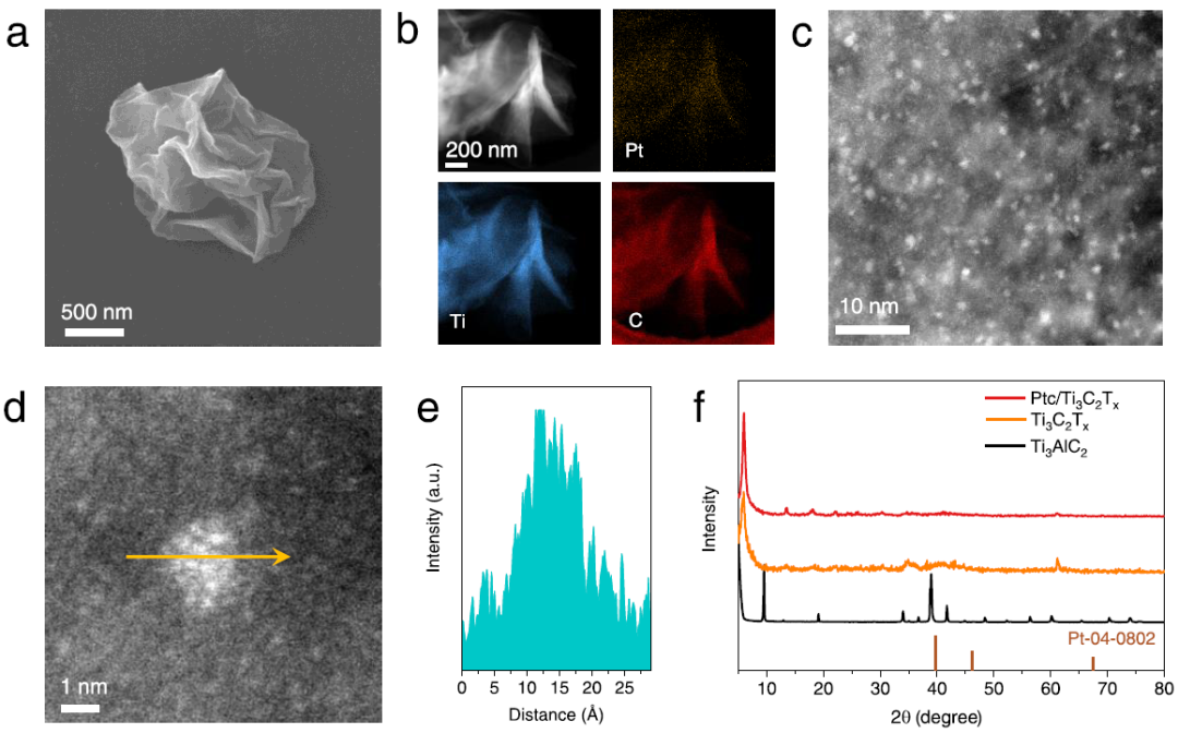 图1. (a) Ptc/Ti3C2Tx 的扫描电子显微镜 (SEM) 图像。(b) Ptc/Ti3C2Tx的 HAADF-STEM 图像和相应的能量色散光谱 (EDS)元素mapping图像。(c) Ptc/Ti3C2Tx的 HAADF-STEM 图像。(d, e) Ptc/Ti3C2Tx的 HAADF-STEM 图像和相应的线性强度分布。(f) Ti3AlC2, Ti3C2Tx, 和Ptc/Ti3C2Tx 的XRD图谱。