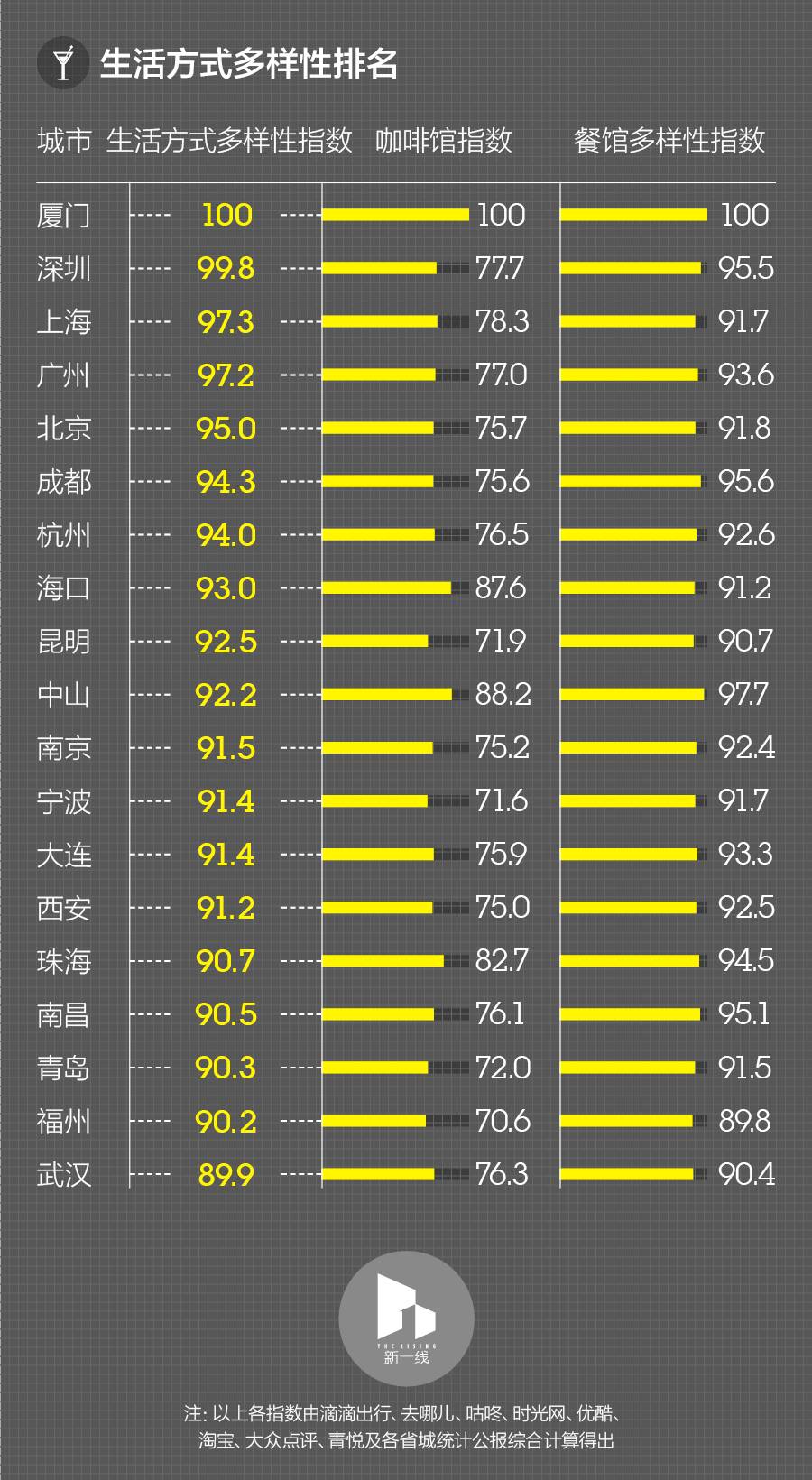 一座城市的生活方式更“好”,意味着这座城市的消费者质量更高——很多时候公司会更看重这一点。年轻人的生活方式越来越多元,新一线整合了来自去哪儿、咕咚运动、时光网、优酷、淘宝等互联网平台上的数据和部分线下实体门店的数据,计算出各城市的“生活多样性指数”。