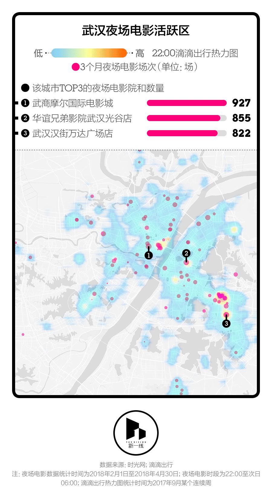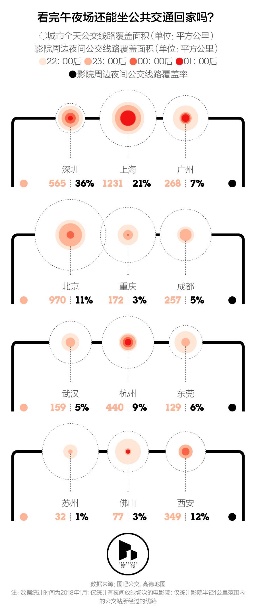 从结果看,遗憾的是,如果你生活在重庆、成都、武汉、东莞或苏州,你几乎找不到0点之后还能坐公交回家的电影院——重庆、成都和武汉还是新一线城市中2017年度夜场电影最多的城市。