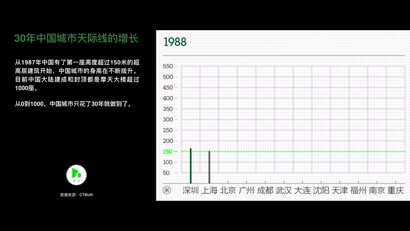 从 1987 年开始,中国从零到现在,三十年之后,建立了超过一千座摩天大楼。这里说的摩天大楼是国际上对于超高层建筑的定义,是在一百五十米以上的。你们可以看到的是,中国城市的身高在不断地生长,而这种密集的生长当中,给我们带来的,就不仅仅是我们生活的空间的变化,更多的是对我们视觉上,对我们意识上的一种理解。但你可能还会问我,除了那 80% 的人,剩下的 20% 的设计师给你交了一份什么样的作业。