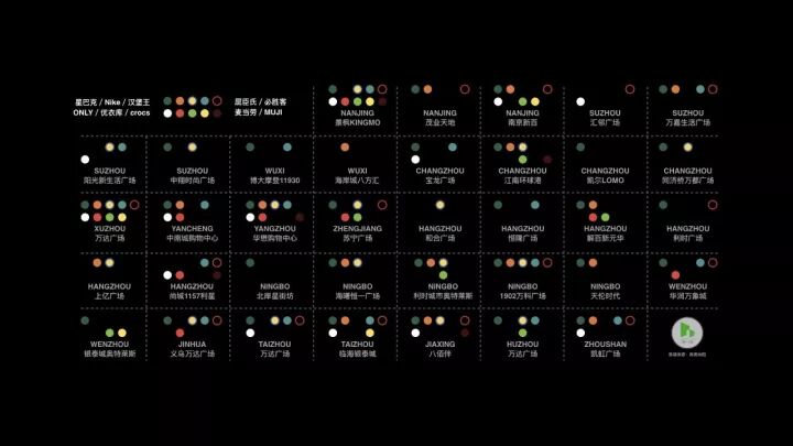 然后我找了里面最热门的品牌,其中开店数量最多的是星巴克,三十六个商场里你知道开了几家吗?二十四家。然后还有一些品牌,比方说耐克,比方说汉堡王,还有必胜客、屈臣氏这样的品牌。它们的进驻量也是达到了三分之一以上。如果你直接看这个图,图上可以告诉你的是,这些商场长的非常的相似。