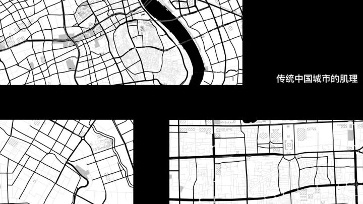 为了解决这个疑惑,我又去翻了翻地图,我找了一些在前工业时代被规划好的城市,现在留在城市里的足迹,比方说最上面的是上海老城厢的部分,左下角是成都春熙路附近这些老的街区,然后右下角是北京前门大栅栏附近,这也是大家非常熟悉的三种形态:上海的弄堂、成都的巷子、和北京的胡同。我们可以看到这种肌理是非常感人的。