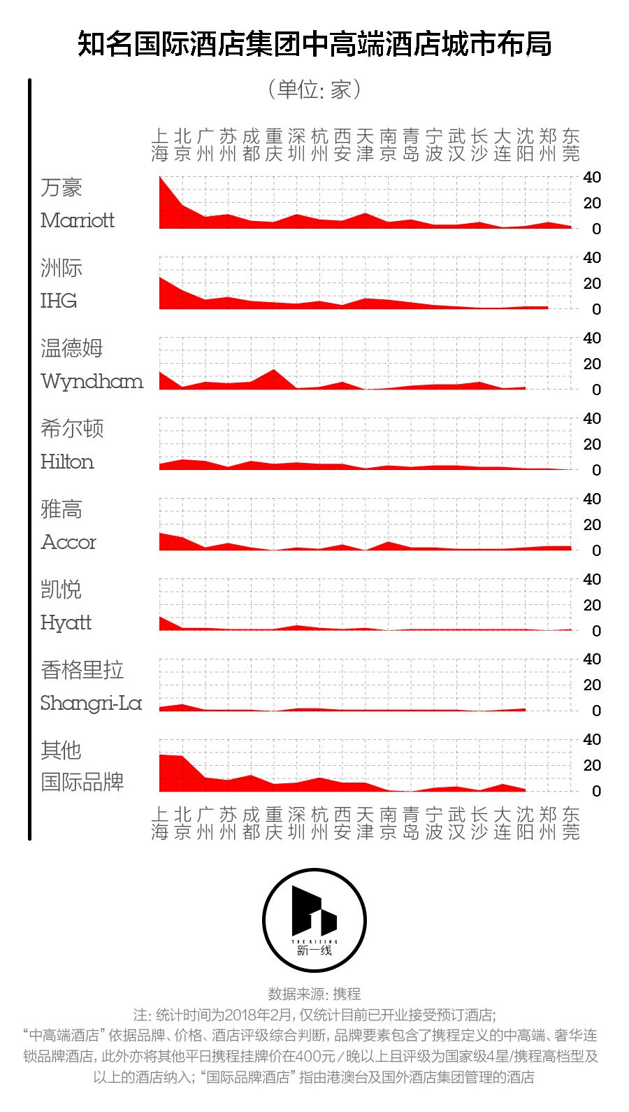 新一酱把携程上的酒店依据品牌、价格、酒店评级综合划分,将携程定义的中高端、奢华连锁品牌酒店,以及其他平日携程挂牌价在400元/晚以上且评级为国家级4星/携程高档型及以上的酒店划分成了“中高端酒店”。