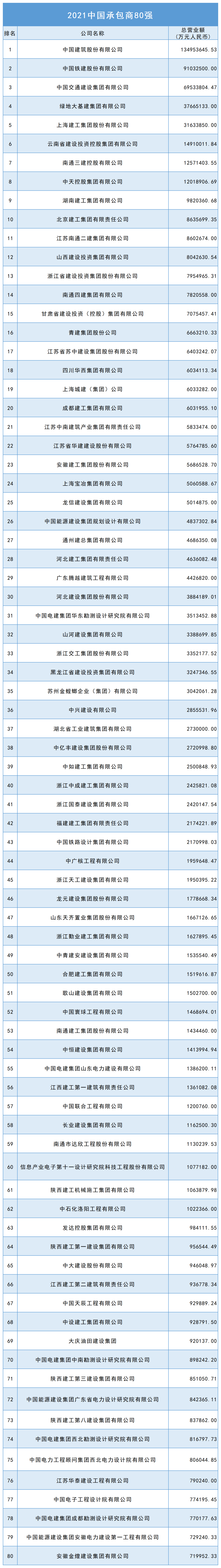 2021中国承包商80强(以2020年工程承包营业收入为依据)