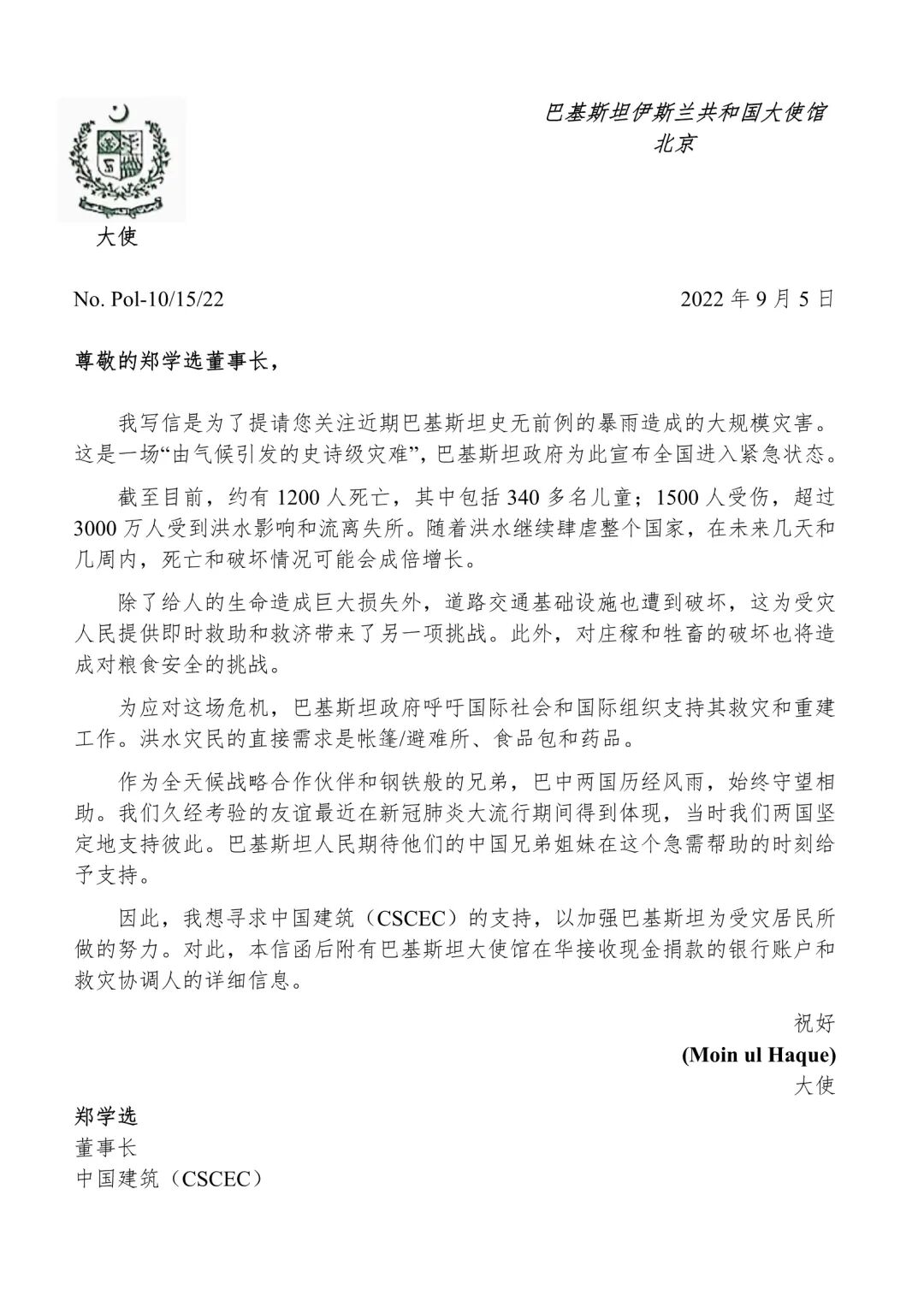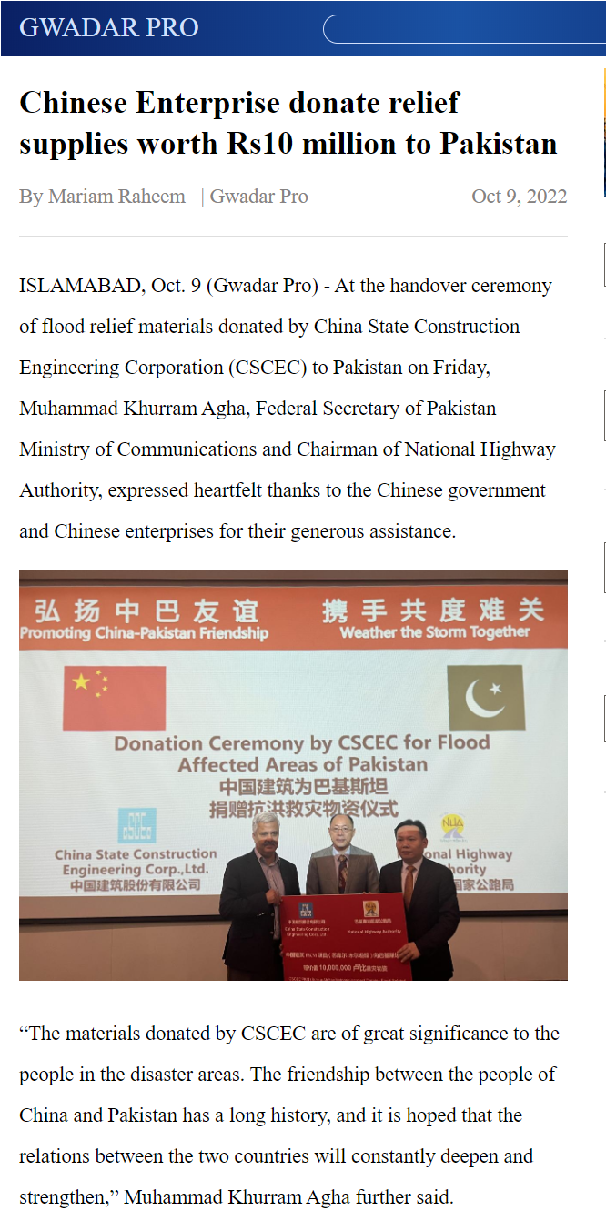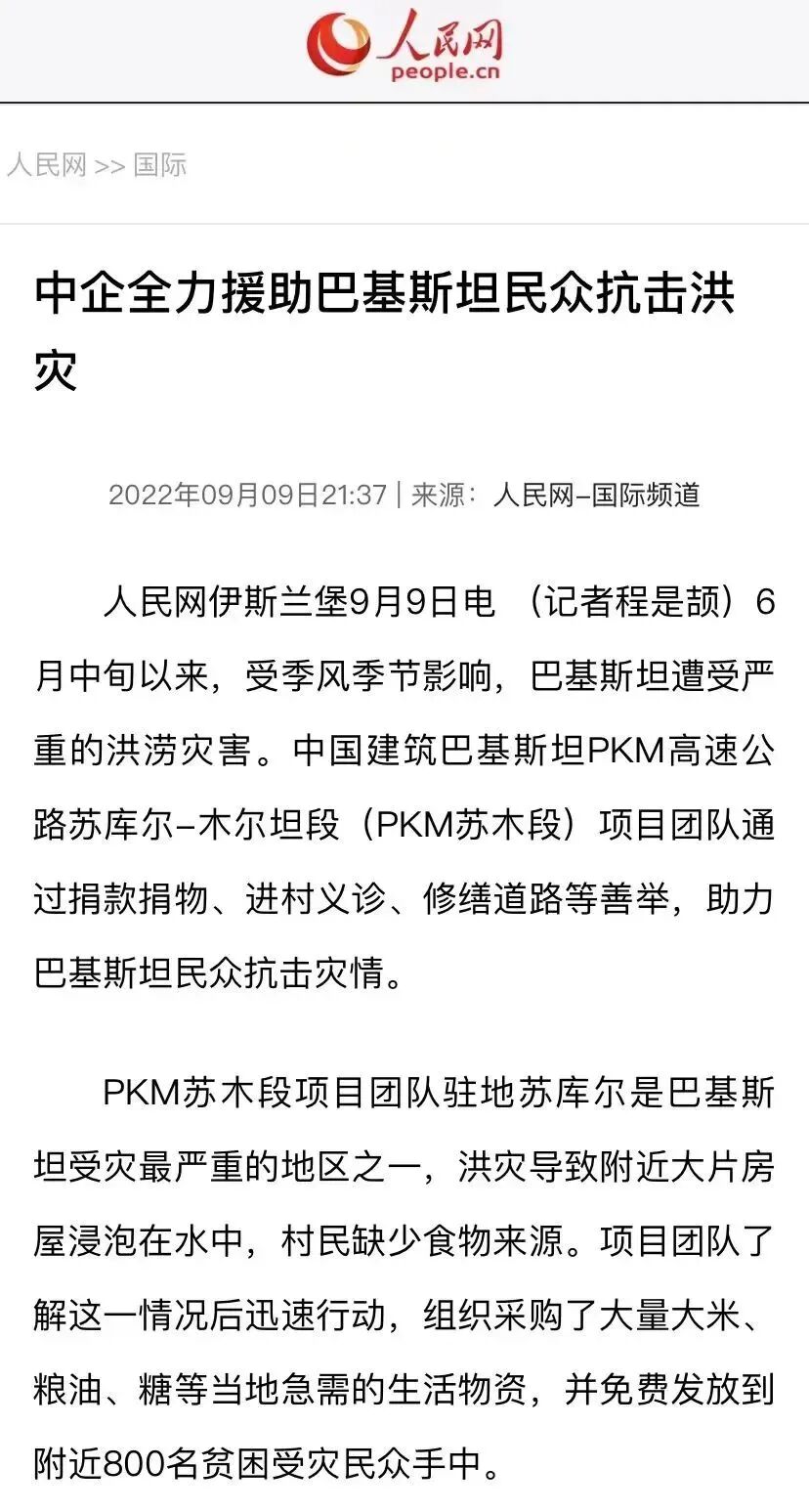 中国建筑积极践行“一带一路”倡议,以实际行动巩固中巴友谊,在巴发生洪灾后,旗下中建三局和中建国际牵头,中建驻巴各单位配合,迅速开展了紧急救援、捐资捐物、进村义诊、修缮道路等一系列行动。