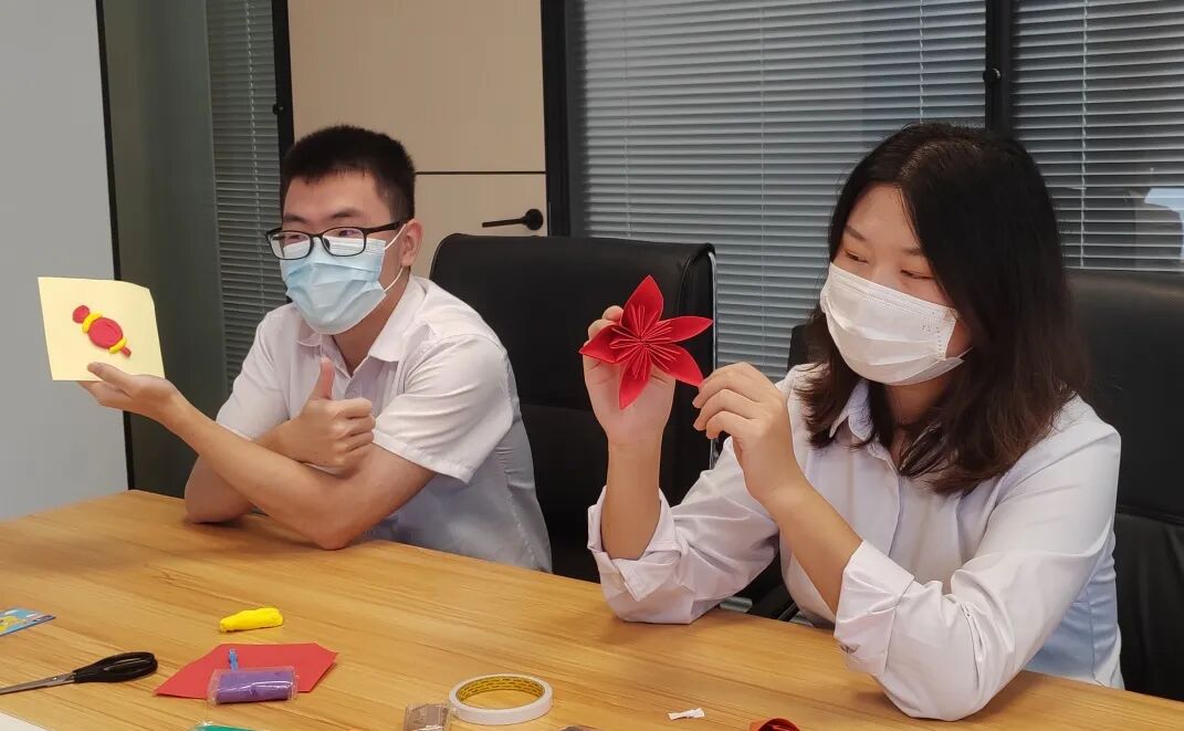 科创公司职工“巧手生花”,用橡皮泥捏出中国结、红灯笼和京剧脸谱等,庆祝新中国成立73周年。