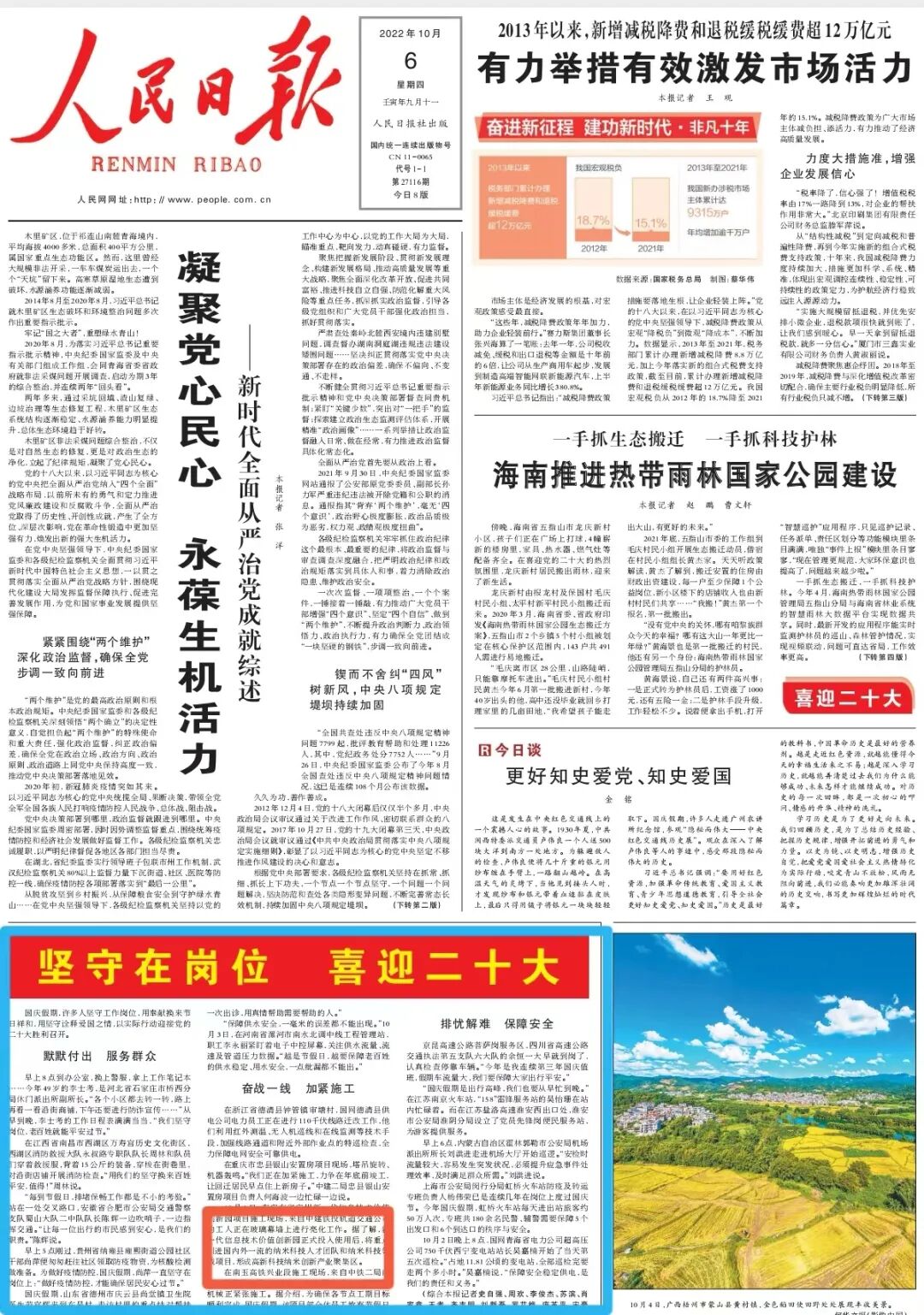 10月6日,人民日报头版刊文《坚守在岗位 喜迎二十大》。报道国庆假期,中建铁投轨道交通公司的工人在广东省广州新一代信息技术价值创新园项目坚守工作岗位,用奉献换来节日祥和,用坚守诠释爱国之情,以实际行动迎接党的二十大胜利召开。