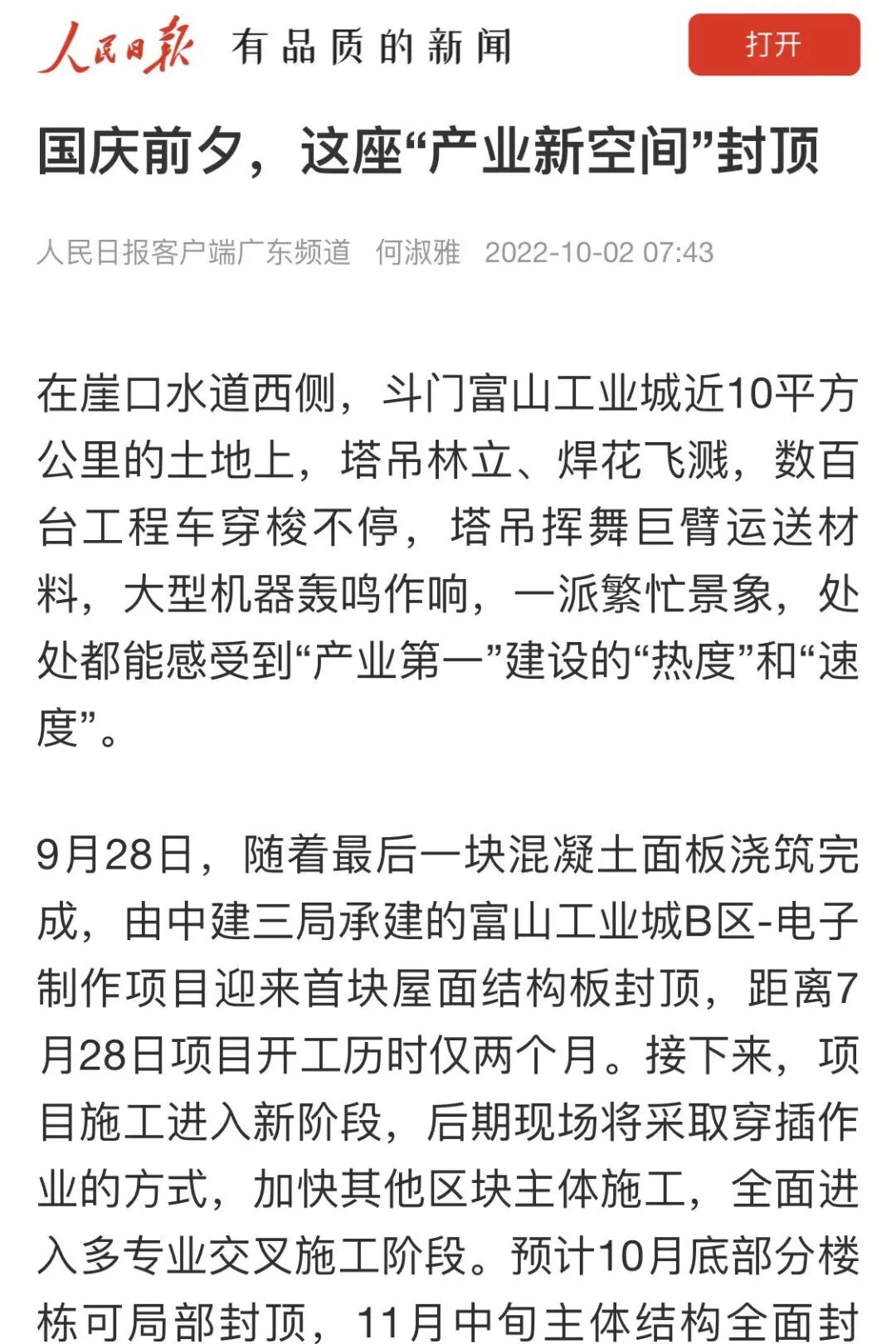 10月2日,人民日报客户端刊文《国庆前夕,这座“产业新空间”封顶》,报道由中建三局一公司承建的富山工业城B区-电子制作项目迎来首块屋面结构板封顶,全面进入多专业交叉施工阶段。