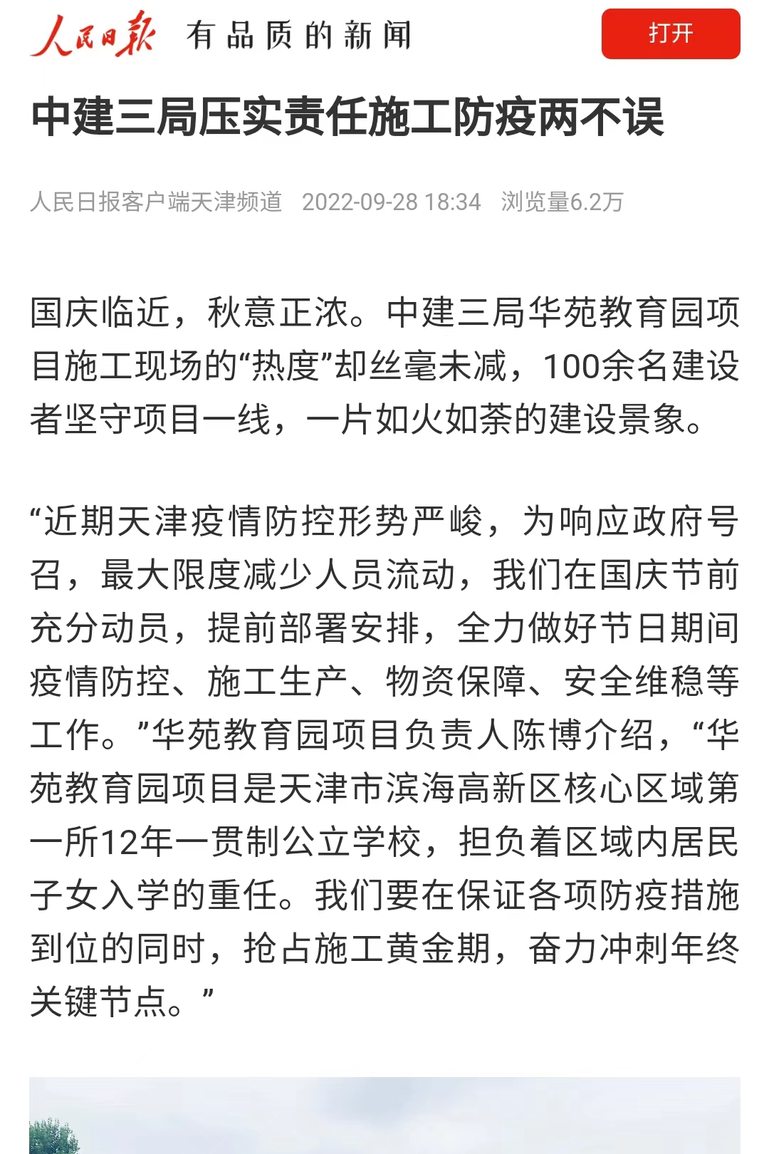 9月28日,人民日报客户端刊文《中建三局压实责任施工防疫两不误》,报道国庆临近,秋意正浓,中建三局华苑教育园项目施工现场的“热度”却丝毫未减,100余名建设者坚守项目一线,一片如火如荼的建设景象。