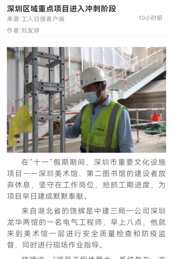 10月6日,工人日报客户端刊文《深圳区域重点项目进入冲刺阶段》,报道在“十一”假期期间,深圳市重要文化设施项目——深圳美术馆、第二图书馆的建设者放弃休息,坚守在工作岗位,抢抓工期进度,为项目早日建成默默奉献。