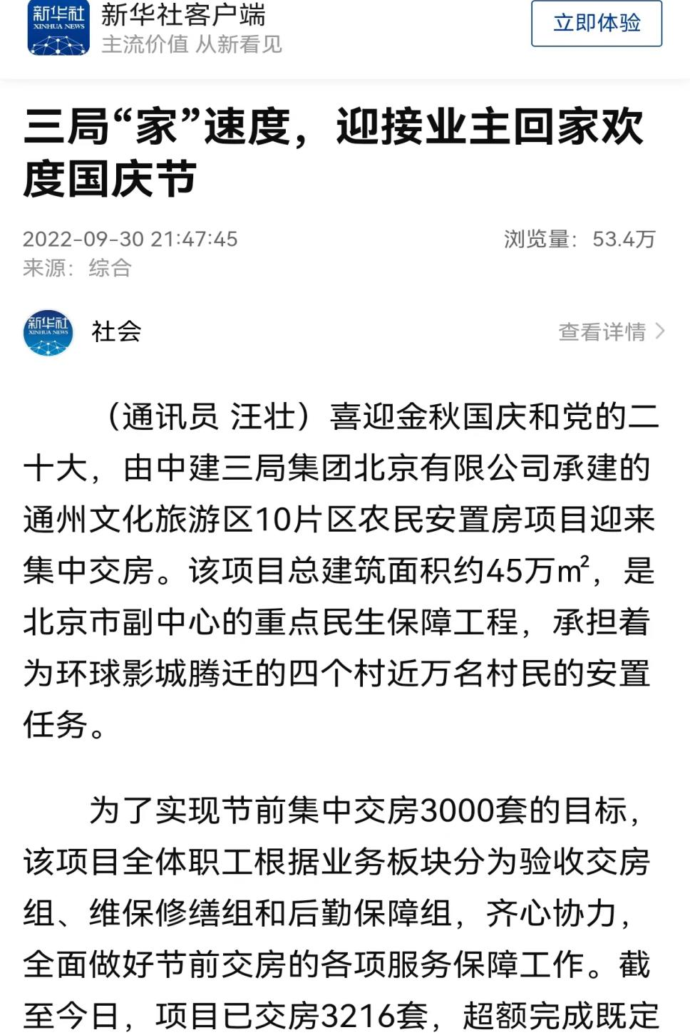 9月30日,新华社刊文《三局“家”速度,迎接业主回家欢度国庆节》,报道由中建三局承建的通州文化旅游区10片区农民安置房项目迎来集中交房,迎接业主回家欢度国庆节,为党的二十大献礼!