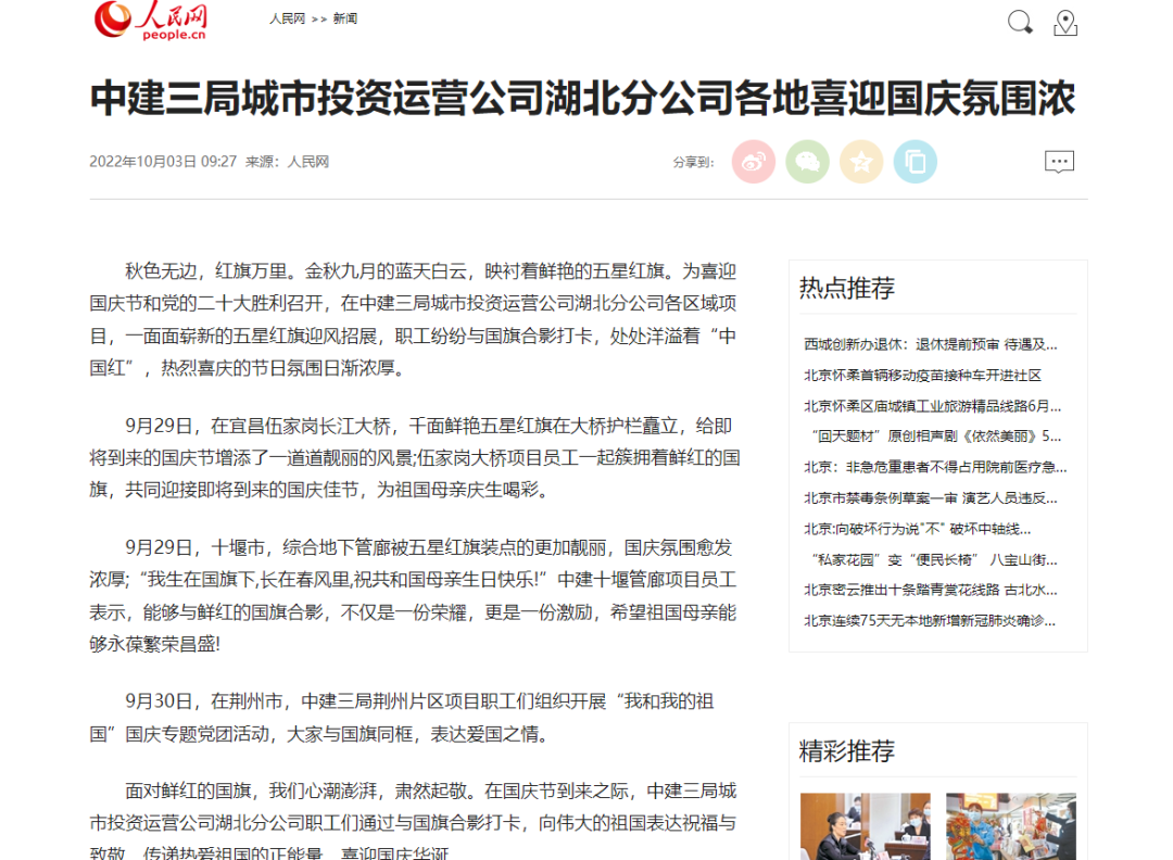 10月3日,人民网刊文《中建三局城市投资运营公司湖北分公司各地喜迎国庆氛围浓》,报道中建三局城市投资运营公司湖北分公司各区域项目,一面面崭新的五星红旗迎风招展,职工纷纷与国旗合影打卡,处处洋溢着“中国红”。