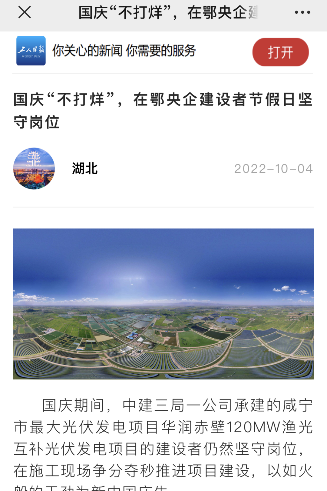 10月4日,工人日报客户端刊文《国庆“不打烊”,在鄂央企建设者节假日坚守岗位》,报道中建三局一公司承建的咸宁市最大光伏发电项目华润赤壁120MW渔光互补光伏发电项目的建设者仍然坚守岗位,在施工现场争分夺秒推进项目建设,以如火般的干劲为新中国庆生。