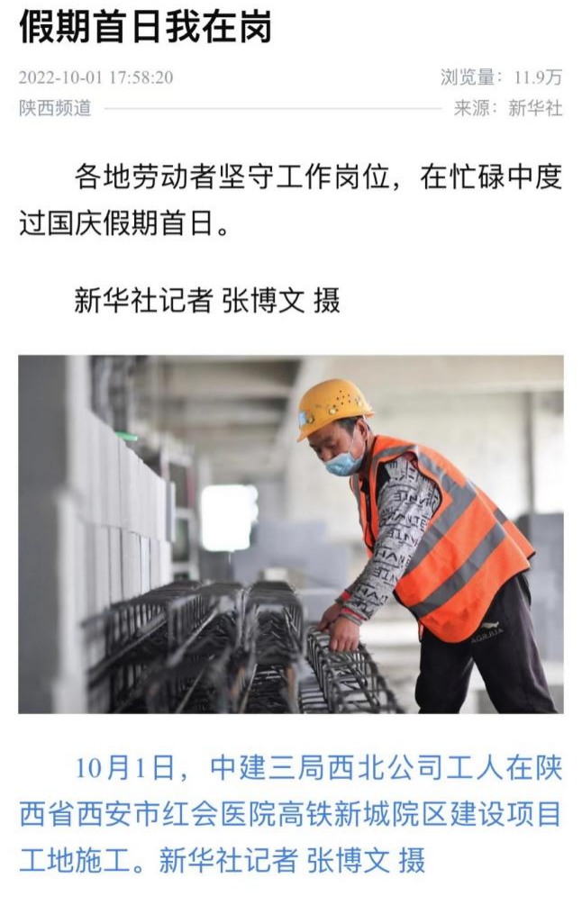 10月1日,新华社刊文《假期首日我在岗》,报道中建三局建设者在国庆假期坚守工作岗位,在陕西省西安市红会医院高铁新城院区建设项目工地抓紧施工。