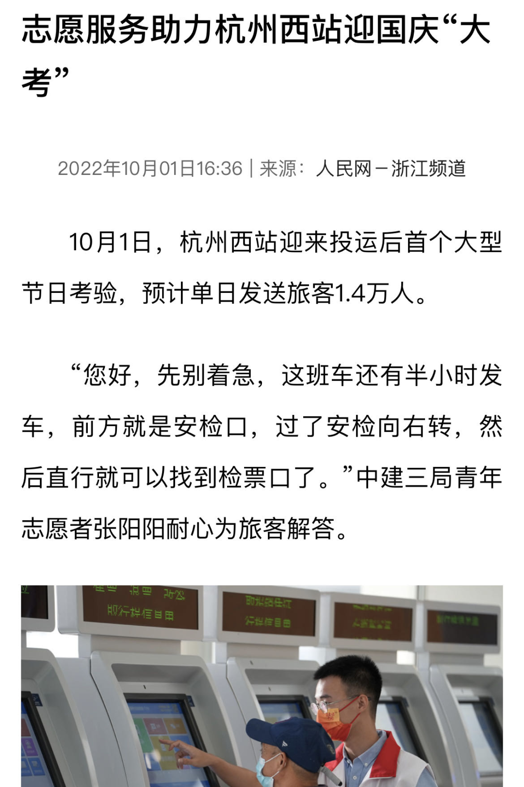 10月1日,人民网刊发《志愿服务助力杭州西站迎国庆“大考”》,报道中建三局浙江公司青年志愿者在杭州西站开展志愿服务,助力杭州西站这一全新城市交通枢纽顺利通过投运以来首个重大节日,用青年的热诚为祖国别样庆生。