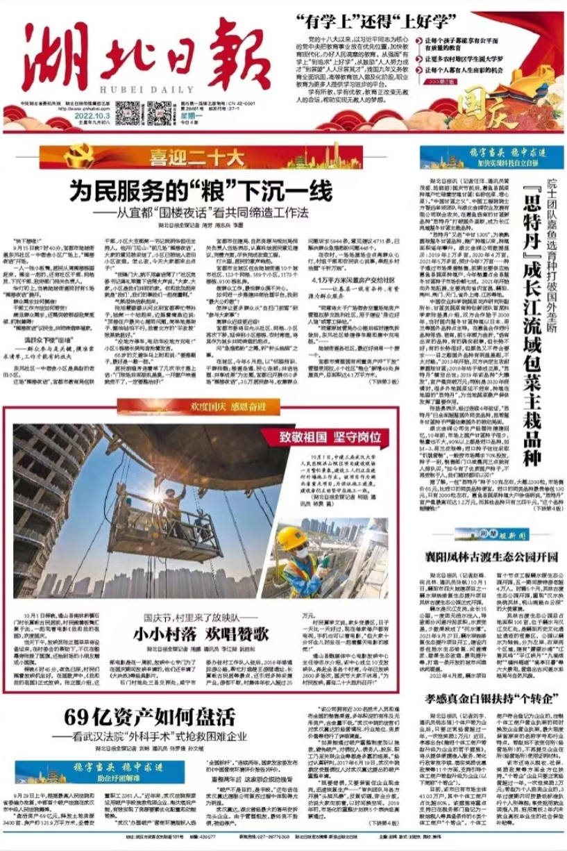 10月2日,新华社新华视频刊文《湖北武汉:建设者假期坚守重大项目保施工》,报道中建三局武汉大学人民医院洪山院区、光谷同济质子大楼项目、湖北广电传媒大厦项目、佛祖岭还建房项目建设者,把假期当工期,全力以赴确保民生工程施工进度。