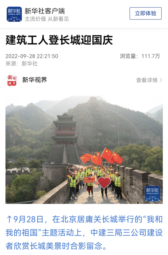 9月28日,新华社刊发《建筑工人登上长城迎国庆》,报道中建三局三公司建设者在北京居庸关长城举行“我和我的祖国”主题活动。